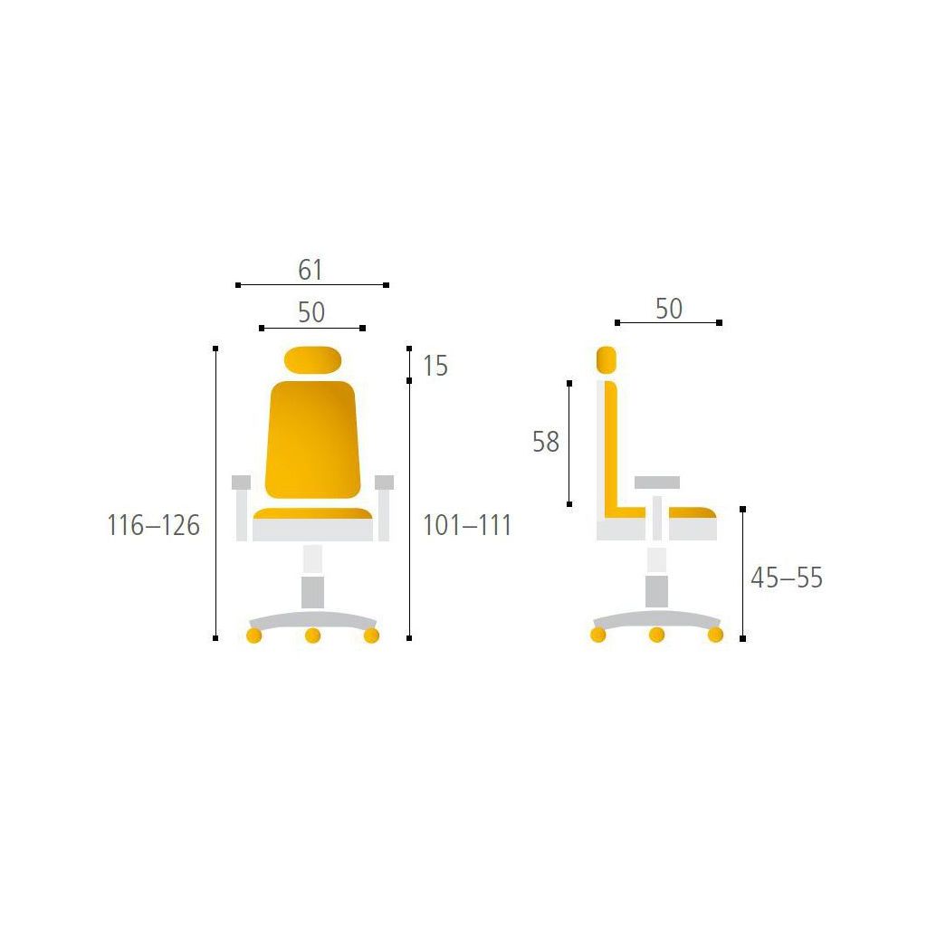 Kancelárska stolička čalúnená s vysokým operadlom. Synchrónny mechanizmus so 4 polohami blokovania. Nastavenie sily protiváhy- podľa telesnej hmotnosti. Výškové nastavenie sedáka. Anatomicky tvarovaný sedák. Obojstranne čalúnené operadlo samonosnou sieťovinou. Výškovo nastaviteľné podrúčky. Nosnosť 120 kg.