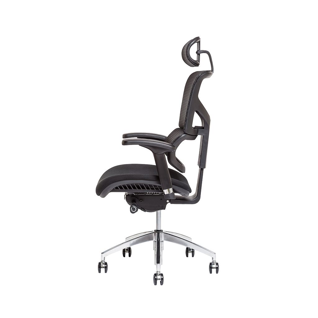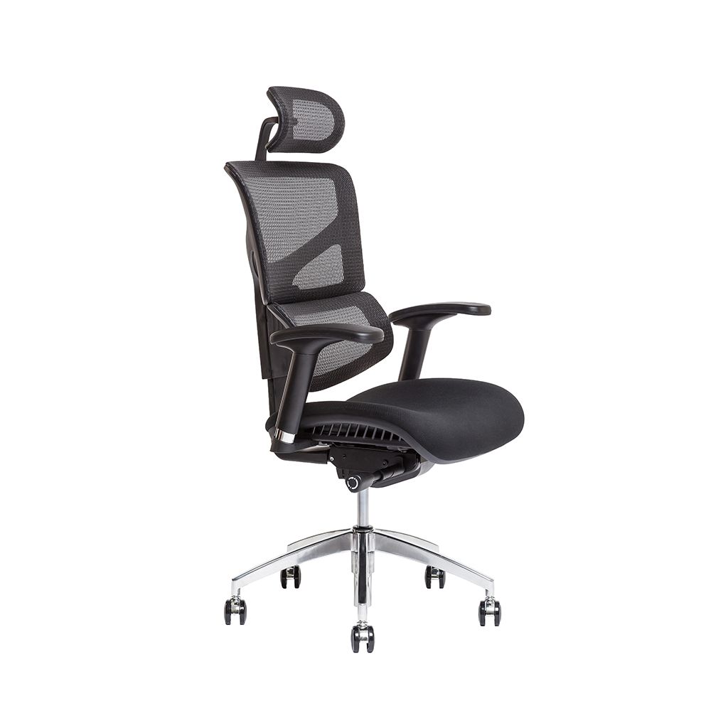 Stabilita a ergonómia je zabezpečená synchrónnym mechanizmom, ktorým meníte polohu sedáka a operáka zároveň. Sedák a operák môžete zafixovať v štyroch polohách. Výšku a hĺbku sedáka prispôsobíte svojej postave priamo na mieru a zaistíte tým správne podopreté nohy. Komfortným nastavením sily protiváhy podľa svojej hmotnosti zabezpečíte operák proti spätnému nárazu. Ergonomická aktívna opierka chrbta podporuje zdravý spôsob sedenia. Nastavením optimálnej výšky operáka v štyroch polohách zvolíte správnu polohu chrbta. Pre väčšie pohodlie si môžete prispôsobiť výšku a uhol hlavovej opierky. Stolička je čalúnená  na chrbáte samonosnou sieťovinou, ktorá zaisťuje celodenné vetranie chrbta. Sedák čalúnený čiernou látkou. Podľa potreby si nastavíte výšku, hĺbku, uhol a posun podrúčiek do strán. Kolieska so zmäkčeným povrchom umožňujú použitie na tvrdej podlahe aj kobercovej krytine. Nosnosť stoličky 135 kg, 3 roky záruka.