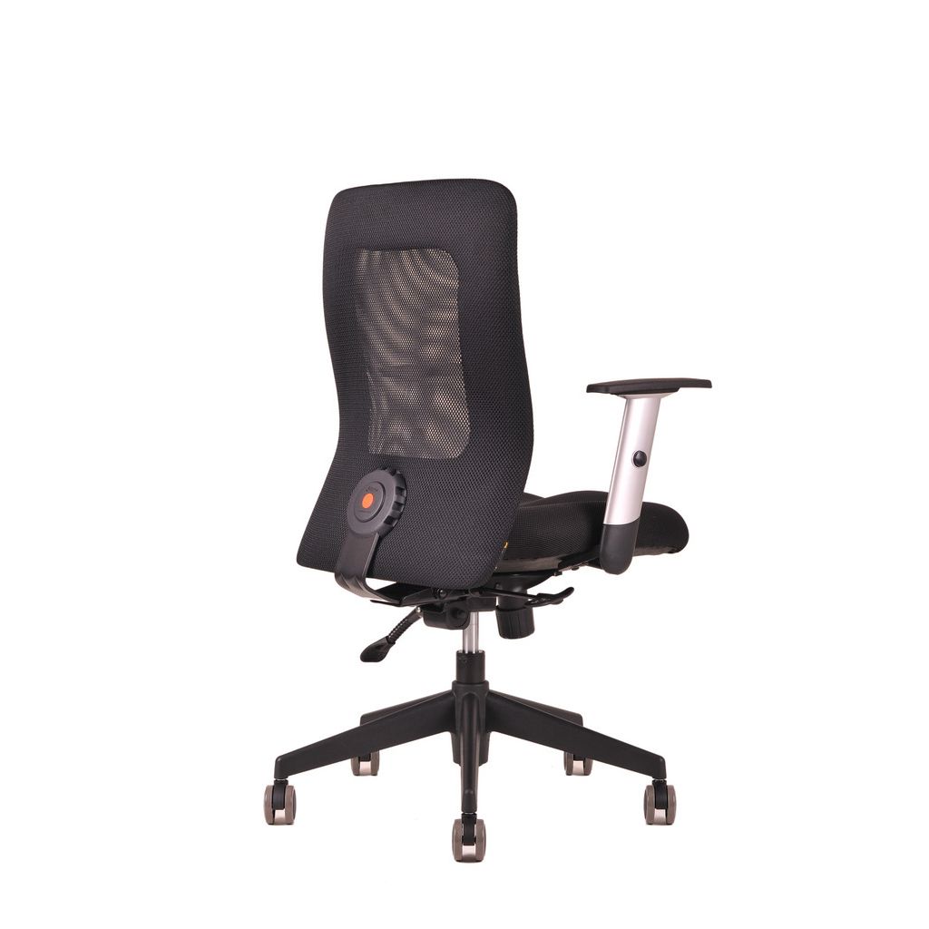 Kancelárska stolička čalúnená Calypso. Synchrónny mechanizmus so 4 polohami blokovania. Nastavenie sily protiváhy- podľa telesnej hmotnosti. Výškové nastavenie sedáka. Anatomicky tvarovaný sedák. Obojstranne čalúnené operadlo samonosnou sieťovinou. Výškovo nastaviteľné podrúčky. Sedák a zadná strana chrbátu vždy čierna.