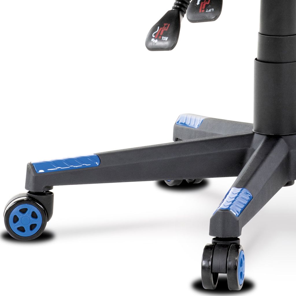Luxusné herné a kancelárske kreslo z kolekcie TOP racing. Jedná sa o moderné designové kreslo, navrhnuté nielen pre náročné požiadavky PC hráčov, ale je prispôsobené aj pre štandardnú kancelársku prácu. To všetko v maximálnom pohodlí a pri dokonalej ergonómii sedenia. Poťah je kombináciou modrej a čiernej perforovanej ekokože na sedáku i operadle, čiernej sieťoviny MESH a čiernej, jemne hrubej látky na sedáku i bokoch opierky hlavy. Operadlo je čierny plastový výlisok vo futuristickom dizajne. Výplň sedadla aj hlavovej opierky je z veľmi kvalitnej a tuhej PU peny, vystuženie a pružnosť zaisťujú látkové popruhy. Kreslo je vybavené permanent contact mechanizmom s plynulou aretáciou. Pri vypnutí je možné sa s operadlom voľne pohupovať. Výška sedenia sa upravuje jednou páčkou na pravej strane cez kvalitný plynový piest. Poloha operadla sa nastavuje druhou páčkou, umiestnenou aj na pravej strane kresla. Masívny čierny plastový kríž s modrými protišmykovými plastovými doplnkami je osadený čiernymi plastovými kolieskami pr. 6 cm s modrým racing stredom a gumovým obvodom ideálnymi na tvrdé podlahy. So stabilitou celých 70 cm priemeru kríža si môžete dovoliť aj tie najnáročnejšie hry. Vysoké, priedušné a ergonomicky navrhnuté operadlo s integrovanou zosilnenou opierkou hlavy, polstrovanou a výškovo nastaviteľnou bedrovou opierkou slúži nielen ako výborná opora celého chrbta a tiež podporuje správne držanie chrbtice. Podrúčky sú plastové, polstrované a potiahnuté modrou a čiernou ekokožou. Šírka je 7 cm, dĺžka ložnej plochy 33 cm a výška 3 cm. Pri sklápaní sedadla sa pohybujú a kopírujú jeho pohyb a polohu. Nosnosť stoličky je až 130 kg. Dodávané v demonte.
