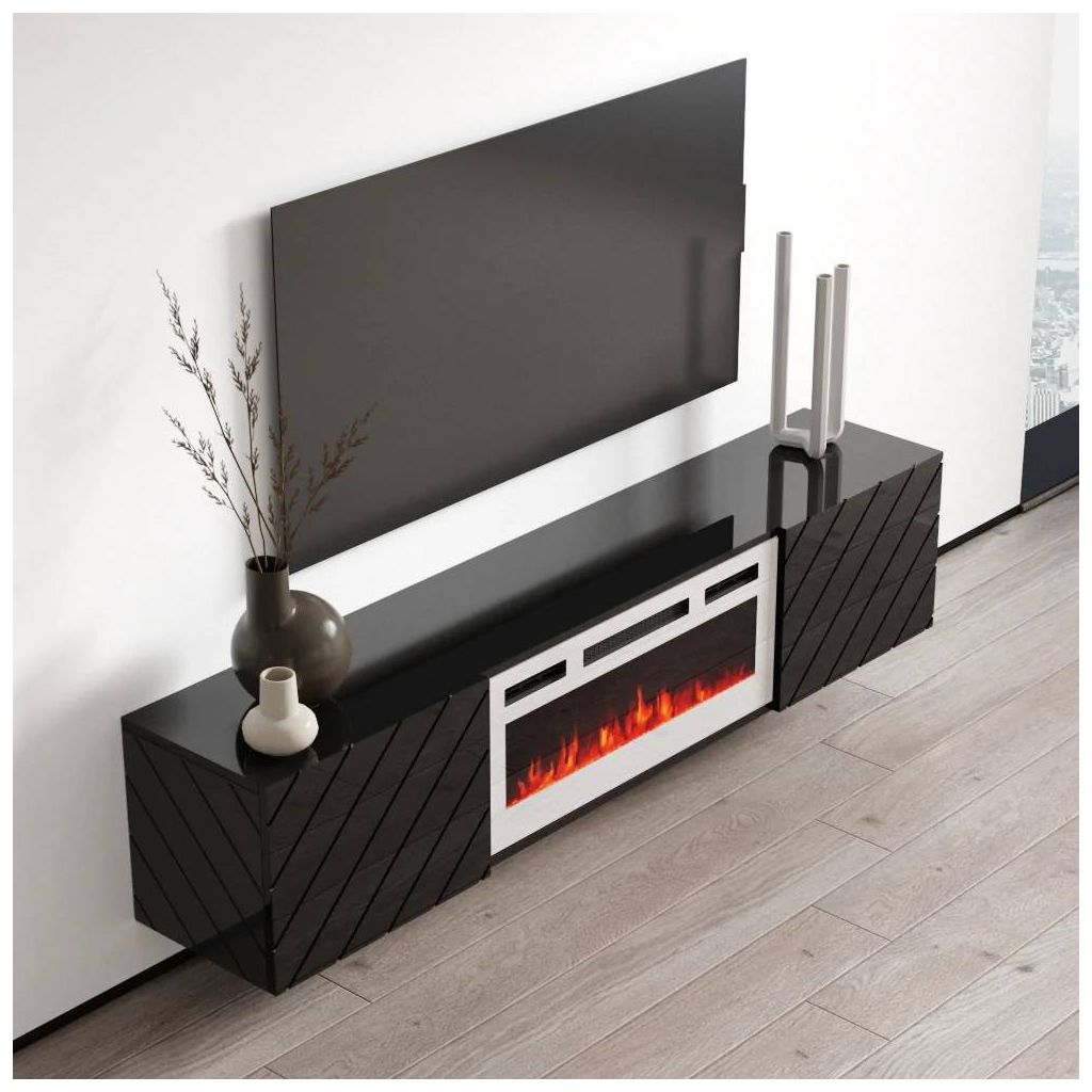 Tv stolík s krbom RTV LUXE EF BLACK A, čierny mat/čierny lesk/komín čierny