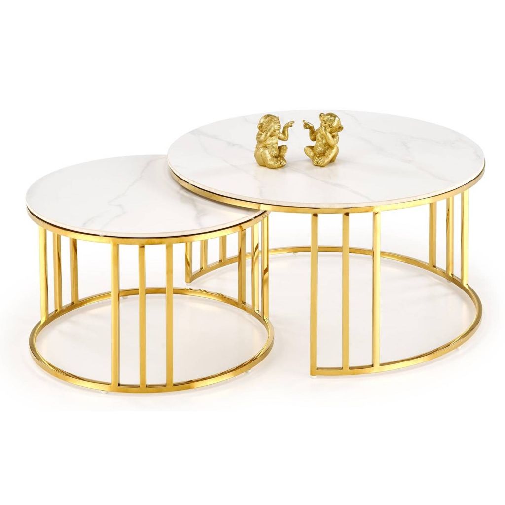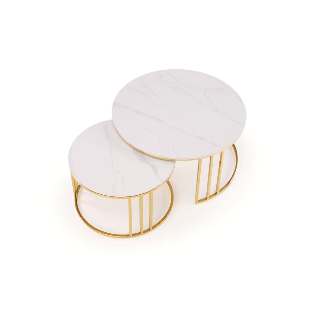 Predstavujeme ideálnu ponuku pre moderné interiéry – set konferenčných stolíkov MERCURY 3. Okrúhle dosky vyrobené z kvalitného spieku, ktorý imituje mramorový vzor, v kombinácii so podstavami z nerezovej ocele v zlatom prevedení pôsobia upravene a noblesne. Tento dizajn bezpochyby prináša do miestnosti elegantný vzhľad. Premyslená konštrukcia, štýlový dizajn a bezchybný vzhľad zaručujú funkčnosť aj estetický zážitok.
