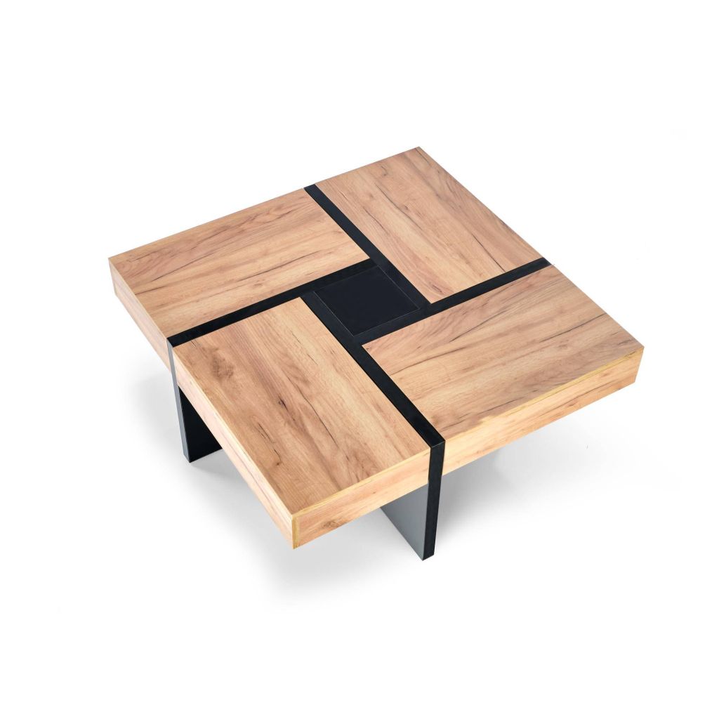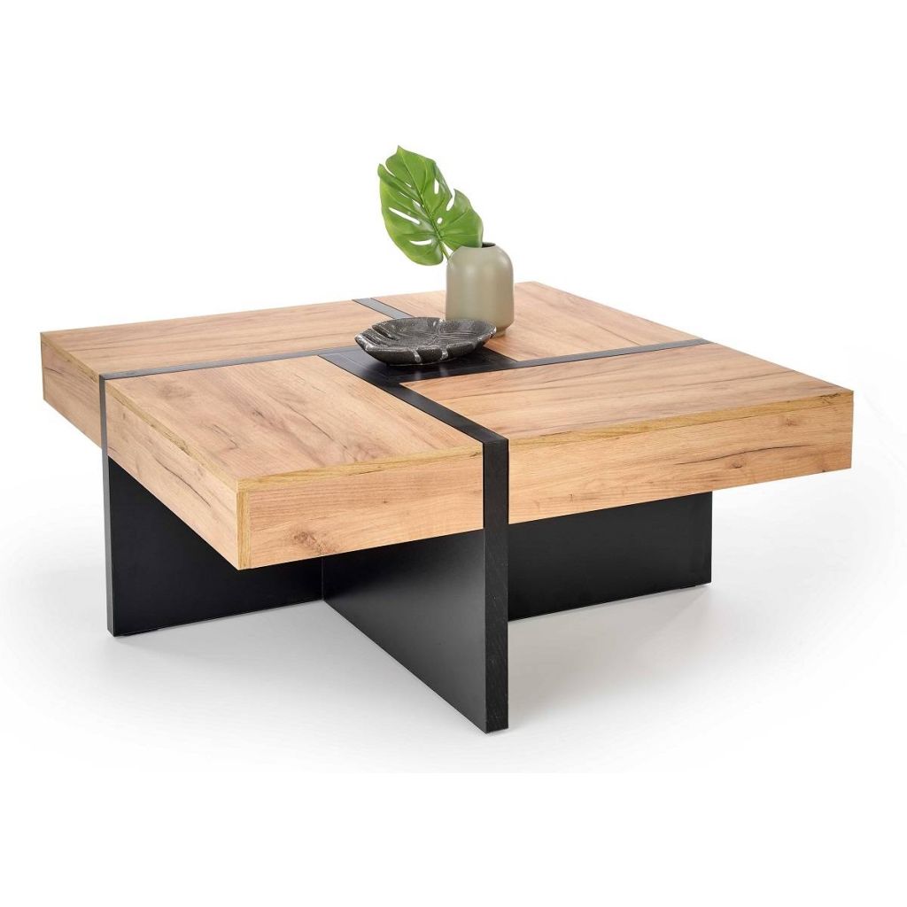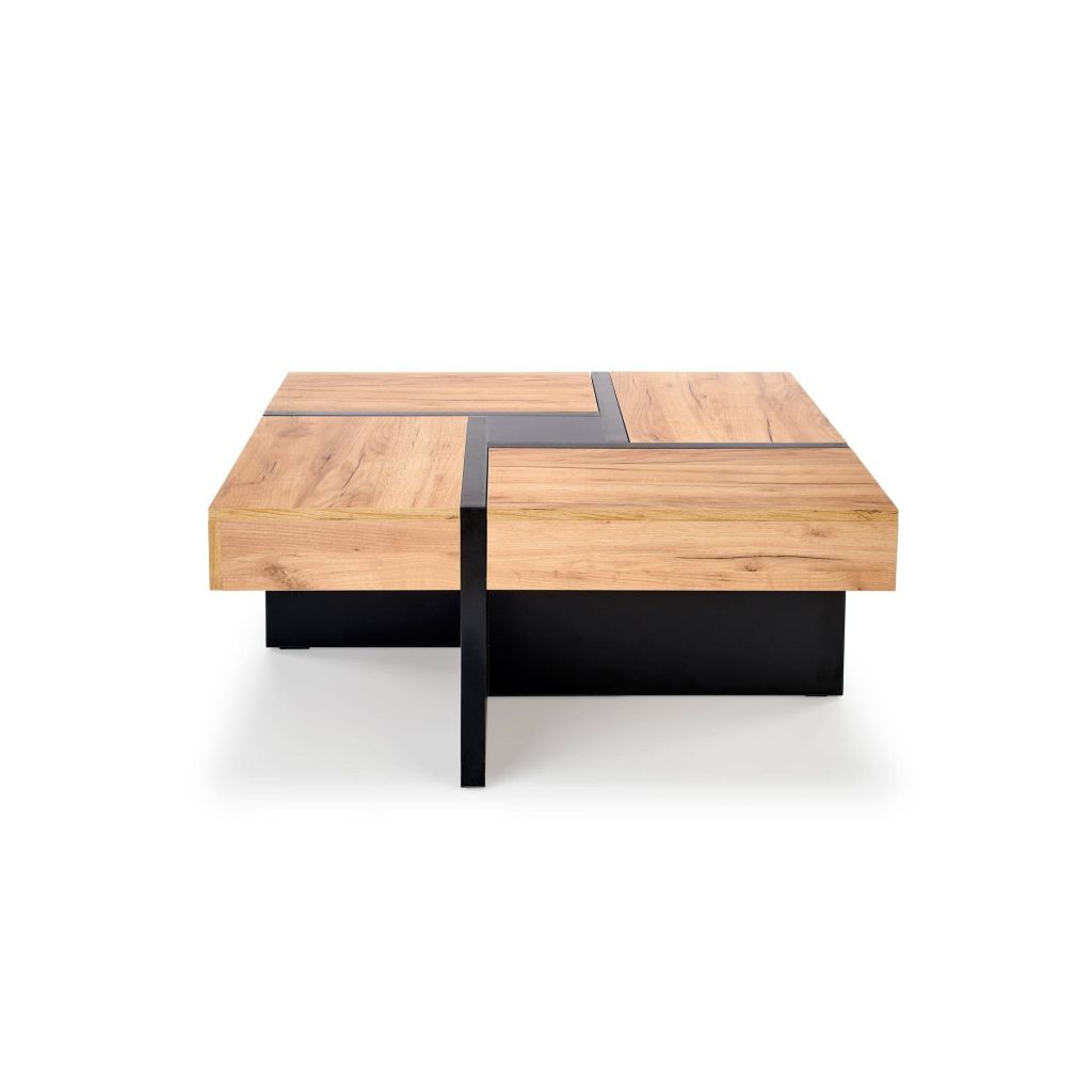 Stolík SEVILLA je ideálnou voľbou pre tých, ktorí uprednostňujú jednoduchosť a funkčnosť v zariadení interiéru. Jeho hlavnou prednosťou je moderný systém výsuvnej dosky, ktorý umožňuje pohodlne uschovať rôzne drobnosti a udržať tak poriadok v obývačke. Vyrobený je z kvalitnej laminovanej drevotriesky, ktorá zaručuje odolnosť a dlhú životnosť. Teplý odtieň duba v kombinácii s matným čiernym podnožím vytvára harmonický a štýlový kontrast. Vďaka svojmu štvorcovému tvaru a úložnému priestoru v podobe štyroch zásuviek sa stolík stane praktickým aj estetickým doplnkom vašej obývacej izby.