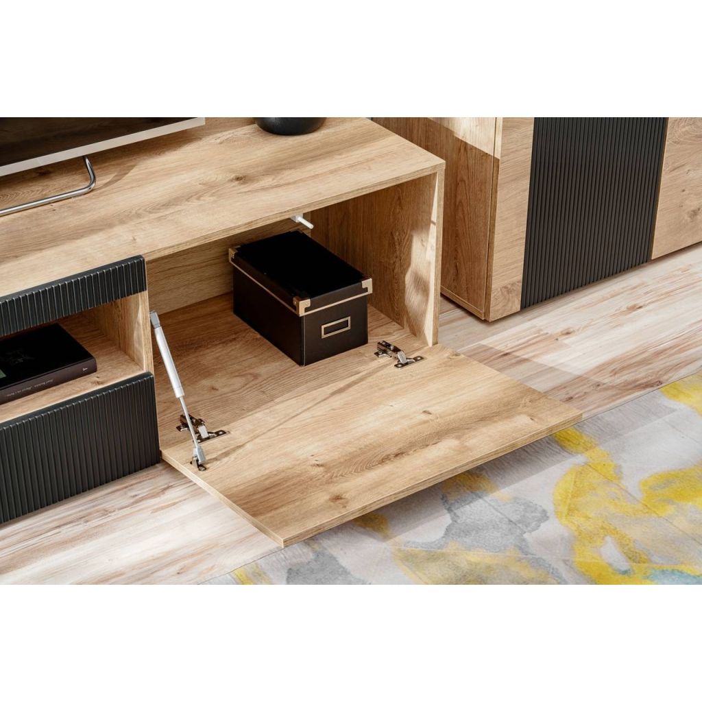 Obývacia stena ARON je modernou a elegantnou zostavou nábytku, ktorá vďaka svojmu nadčasovému dizajnu a kvalitnému spracovaniu obohatí každý interiér. Jednotlivé prvky aj samotné zostavy sa vyrábajú v kombinácii dubu s čiernou a ukrývajú v sebe prírodný vzhľad s modernými prvkami. Matný povrch a čisté línie vytvárajú harmonicky celok, ktorý sa hodí do rôznych štýlových interiérov. Ak hľadáte modernú, funkčnú a štýlovú obývačkovú zostavu, obývačka ARON je ideálnou voľbou pre Váš domov.